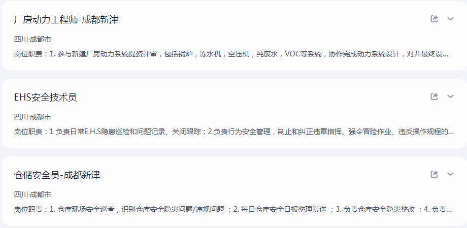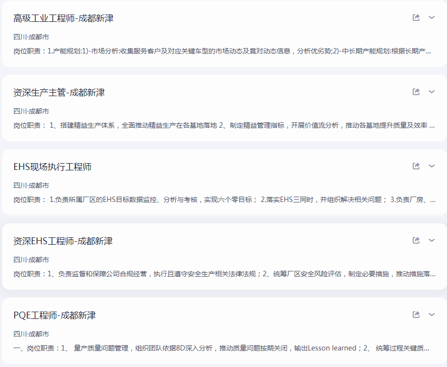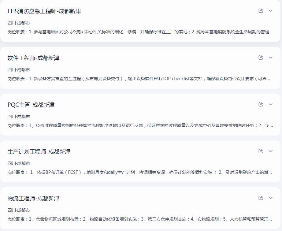 - 岗位方向:设备工程师、电气工程师、厂房动力工程师、PQE 工程师、物流工程师、生产计划工程师、消防应急工程师、EHS 工业安全工程师、高级工业工程师。