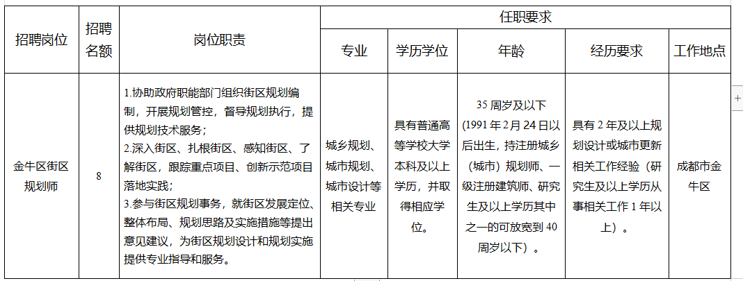金牛区街区规划师8名(负责协助政府职能部门开展街区规划编制,开展规划管控,督导规划执行,提供规划技术指导与服务)。