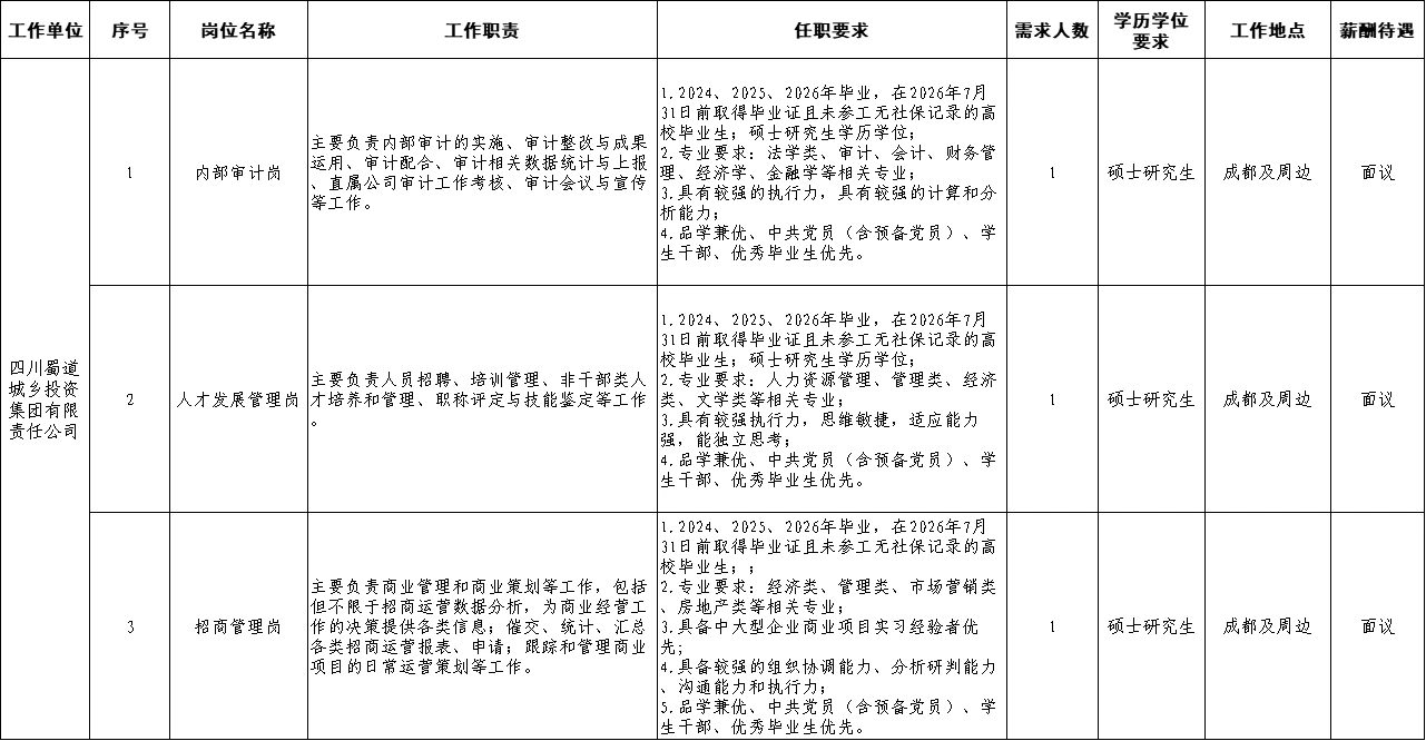 本次招聘内部审计岗1人、人才发展管理岗1人、招商管理岗1人。