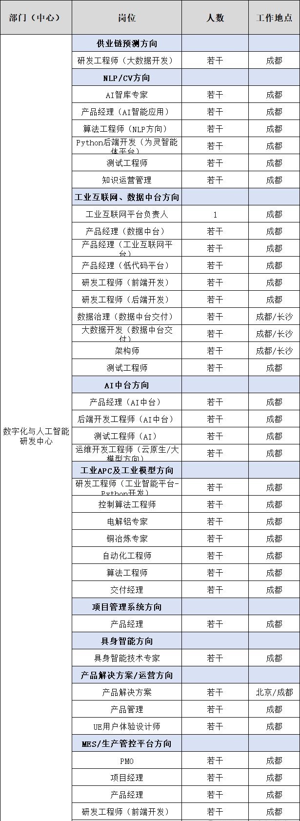 中铝数为(成都)科技有限责任公司(简称中铝数为)是中国铝业集团有限公司(简称中铝集团)全资子公司,是中铝集团数字化转型的承载主体,主要业务包括应用软件、云计算、信息安全技术的开发及技术服务;计算机信息系统集成及相关服务;智能装备、自动化设备、检测设备、仪器仪表、机器人的研发及技术咨询服务;数字化系统运维服务;数字化项目实施等。根据工作需要,现面向社会公开招聘部分岗位人员,现将有关事项公告如下: