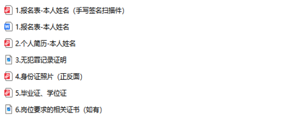 以上报名材料按照“序号+文件名称”格式命名,文件夹按照“报考单位-岗位名称-本人姓名-联系方式-身份证号”格式命名后打包压缩发送,可参考下图,报名资料未按照要求提交的视为报名无效。