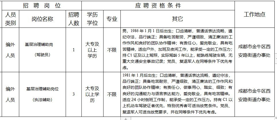 金牛区西安路街道办事处编外工作人员基层治理岗位4名(1名驾驶员,3名执法辅助)。